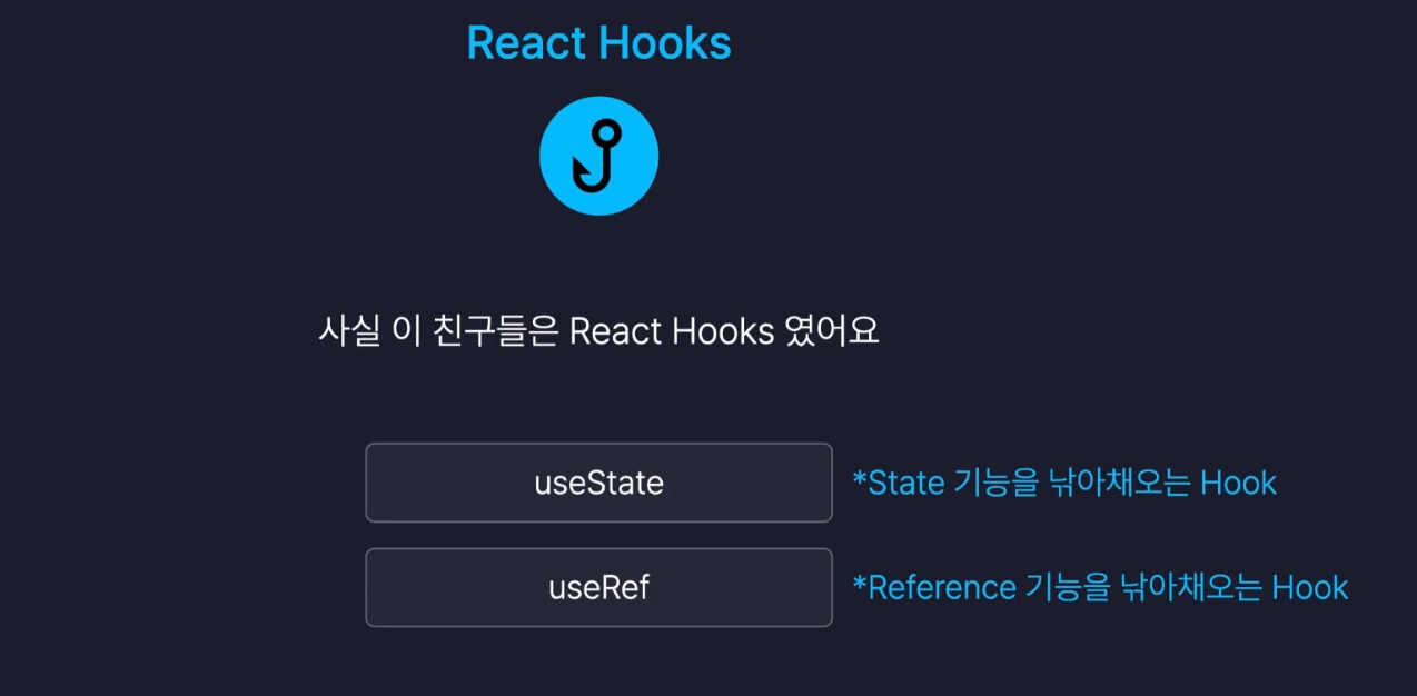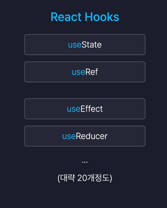 - React Hooks에는 이름 앞에 use라는 접두사가 붙음 (각각의 메서드들은 영어의 단수형으로 hook으로 부름)