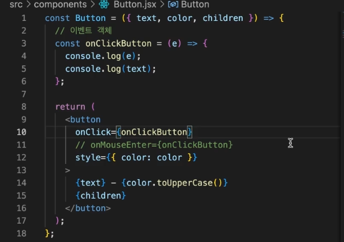 주의할점 이벤트 함수는 함수명만 전달하면 됨 (onClickButton() 형태로 쓰지 않아야함)