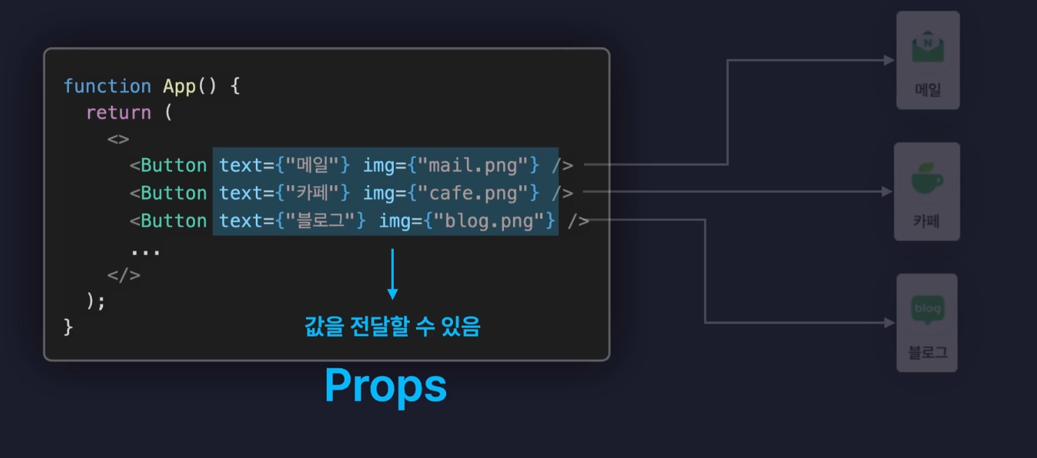 props를 이용하면 컴포넌트를 함수 호출하듯이 전달하는 값에 따라서 각각 다른 UI를 렌더링 하도록 만들 수 있음