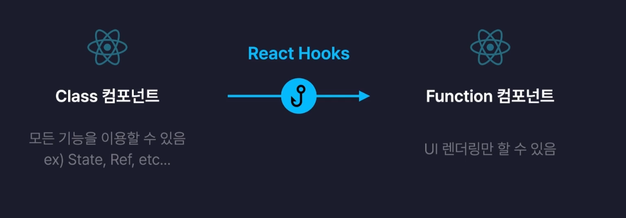 함수 컴포넌트에서도 class 컴포넌트의 기능을 낚아채듯 가져와서 사용할수 있도록 Hooks이 개발됨