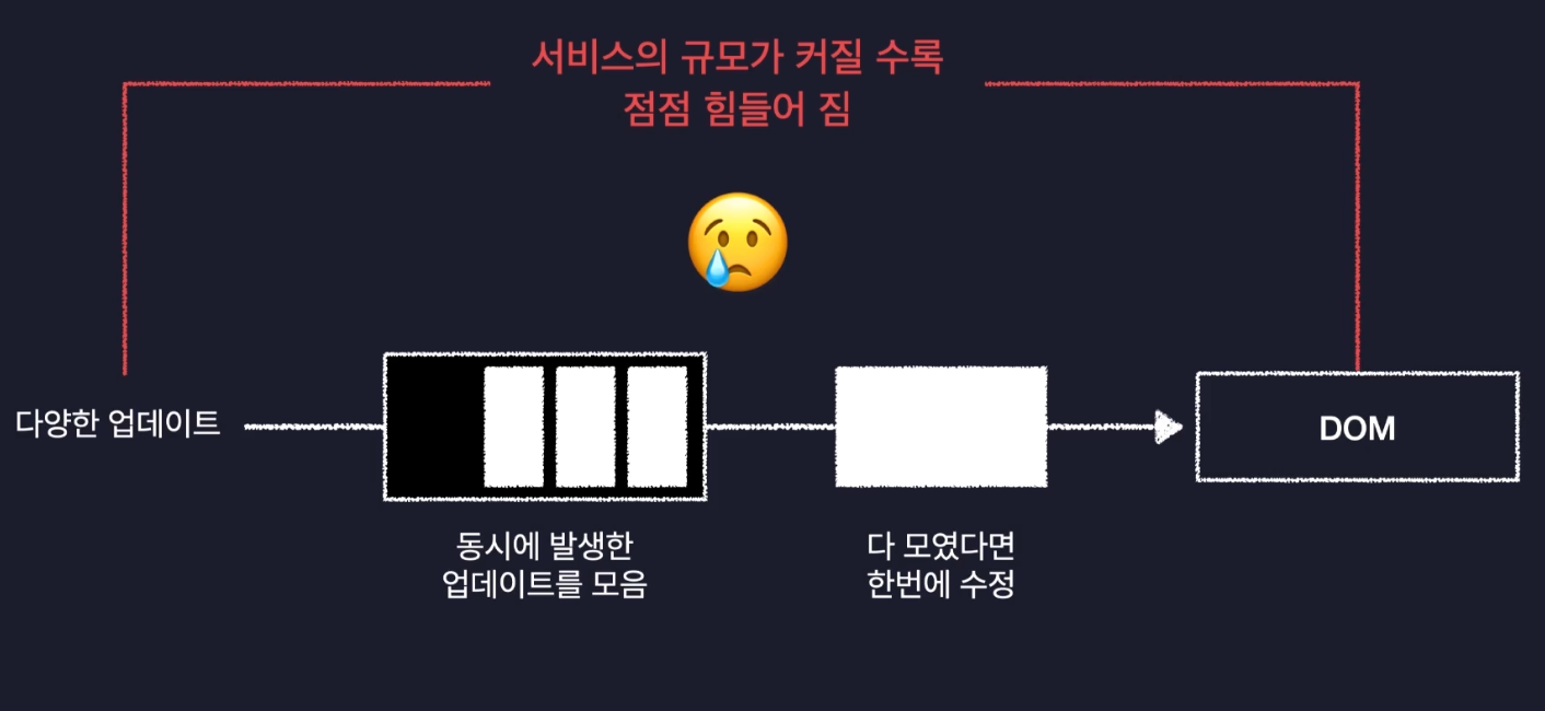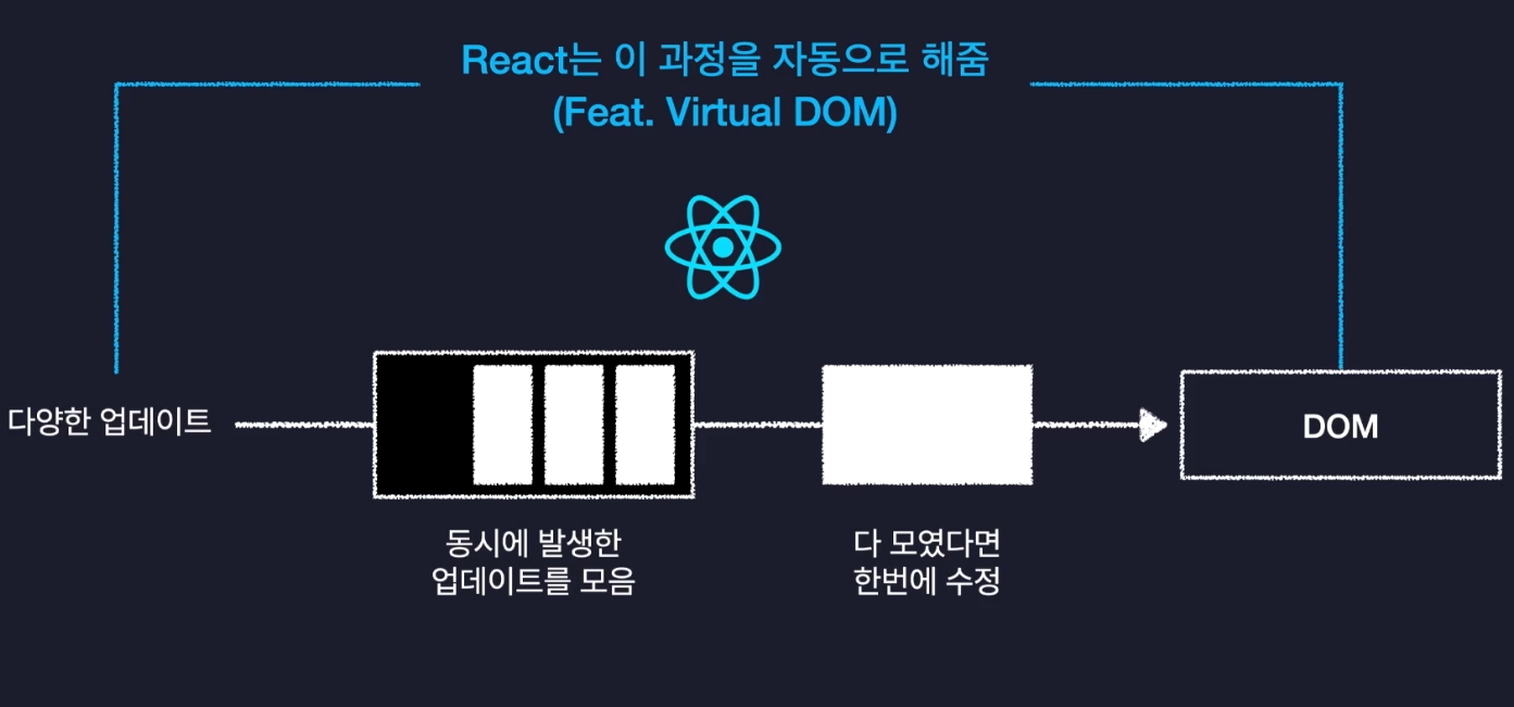 - 동시에 발생한 업데이트들이 모였을 때 모인 업데이트를 한 번에 반영함 (DOM 1회 수정)