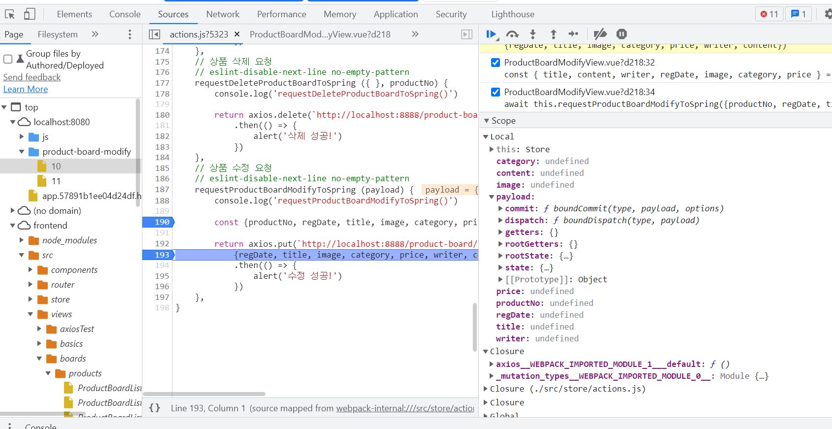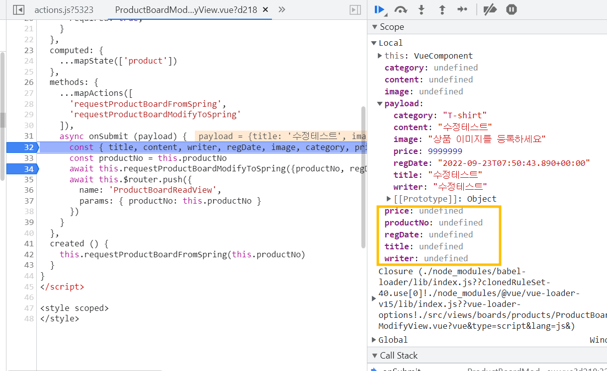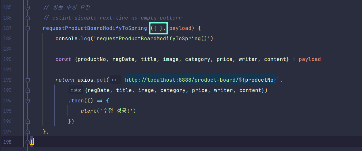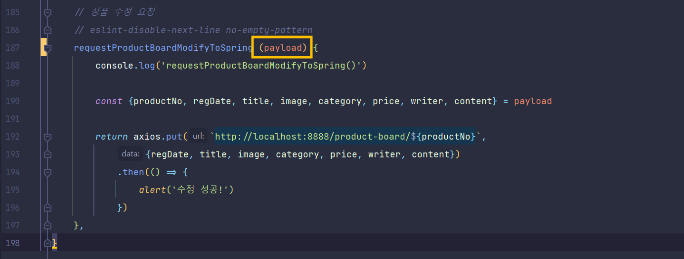 그다음에는 action에서 axios요청을 할 때를 확인했는데 아래 화면과 같이 데이터가 들어가지 않고 있는 것을 확인..!