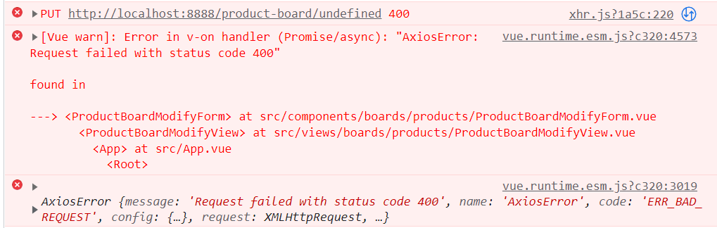 수정 요청은 axios를 사용했는데 에러 메세지에 보이는 것과 같이 axios 요청하는데 무슨 에러가 생긴 것임.