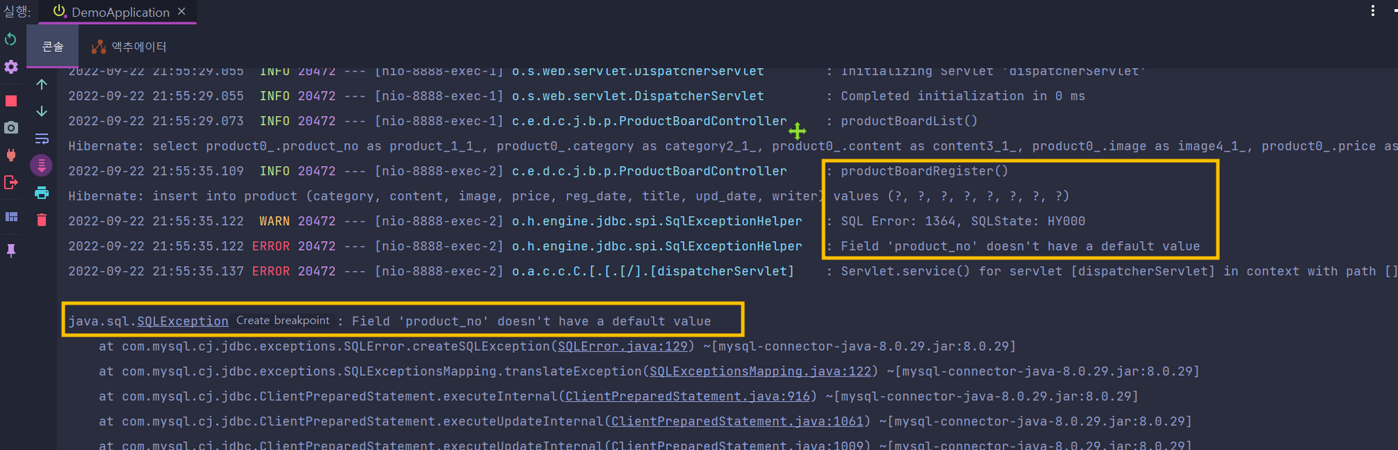 2022-09-22 21:55:35.122 WARN 20472 --- [nio-8888-exec-2] o.h.engine.jdbc.spi.SqlExceptionHelper : SQL Error: 1364, SQLState: HY000