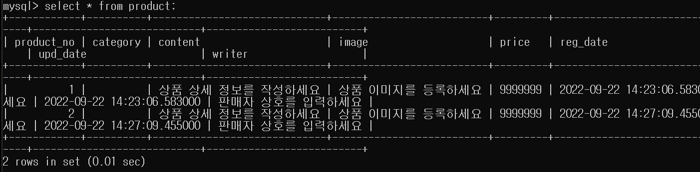 Hibernate: insert into product (category, content, image, price, reg_date, title, upd_date, writer) values (?, ?, ?, ?, ?, ?, ?, ?)